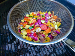 - Cut veggies into bite-sized chunks. (Leave mushrooms whole, but trim stems.) Combine veggies, olive oil, balsamic vinegar, bottled minced garlic, honey, pepper, and salt in a large zip top plastic bag. Refrigerate 1 hour or overnight.